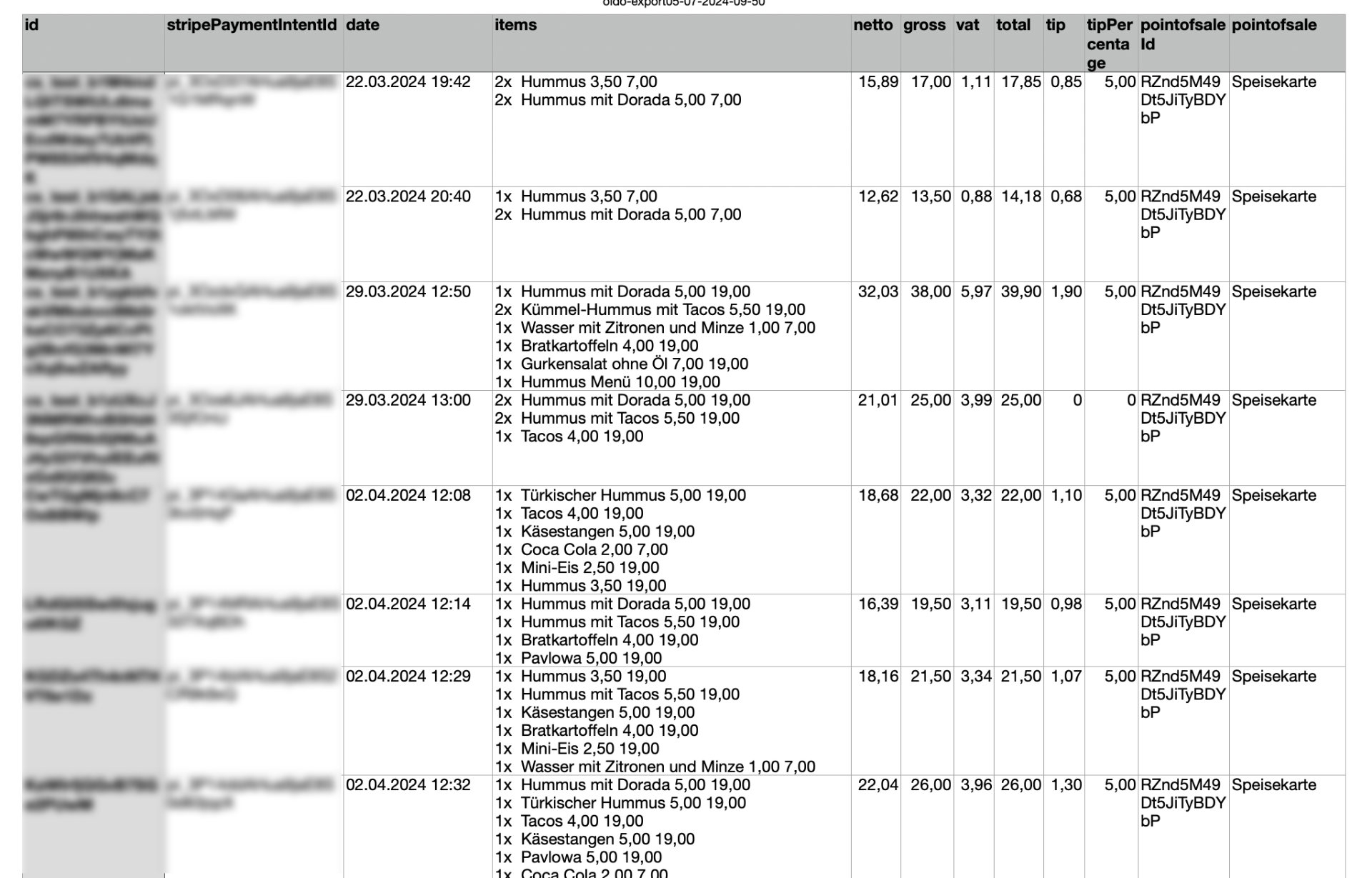 El archivo descargado muestra todas las transacciones de venta realizadas a través de OIDO en forma de tabla. De este modo, puede transferirse 1:1 a su sistema contable. Los ingresos mostrados corresponden a la lista de transacciones de pago procesadas a través de STRIPE.
