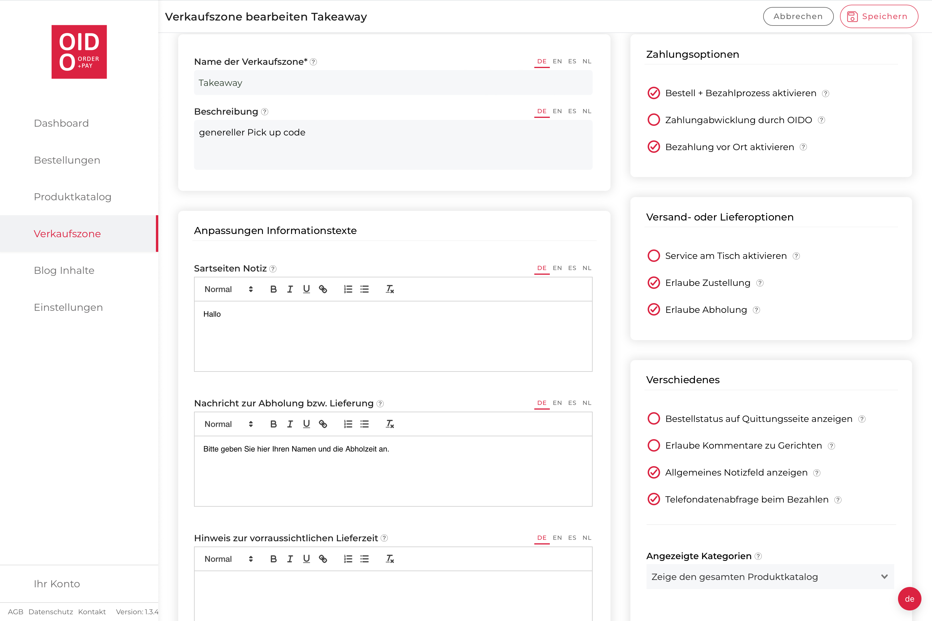 Hier können Sie  den Bestell- und Bezahlvorgang für diese Verkaufszone aktivieren.