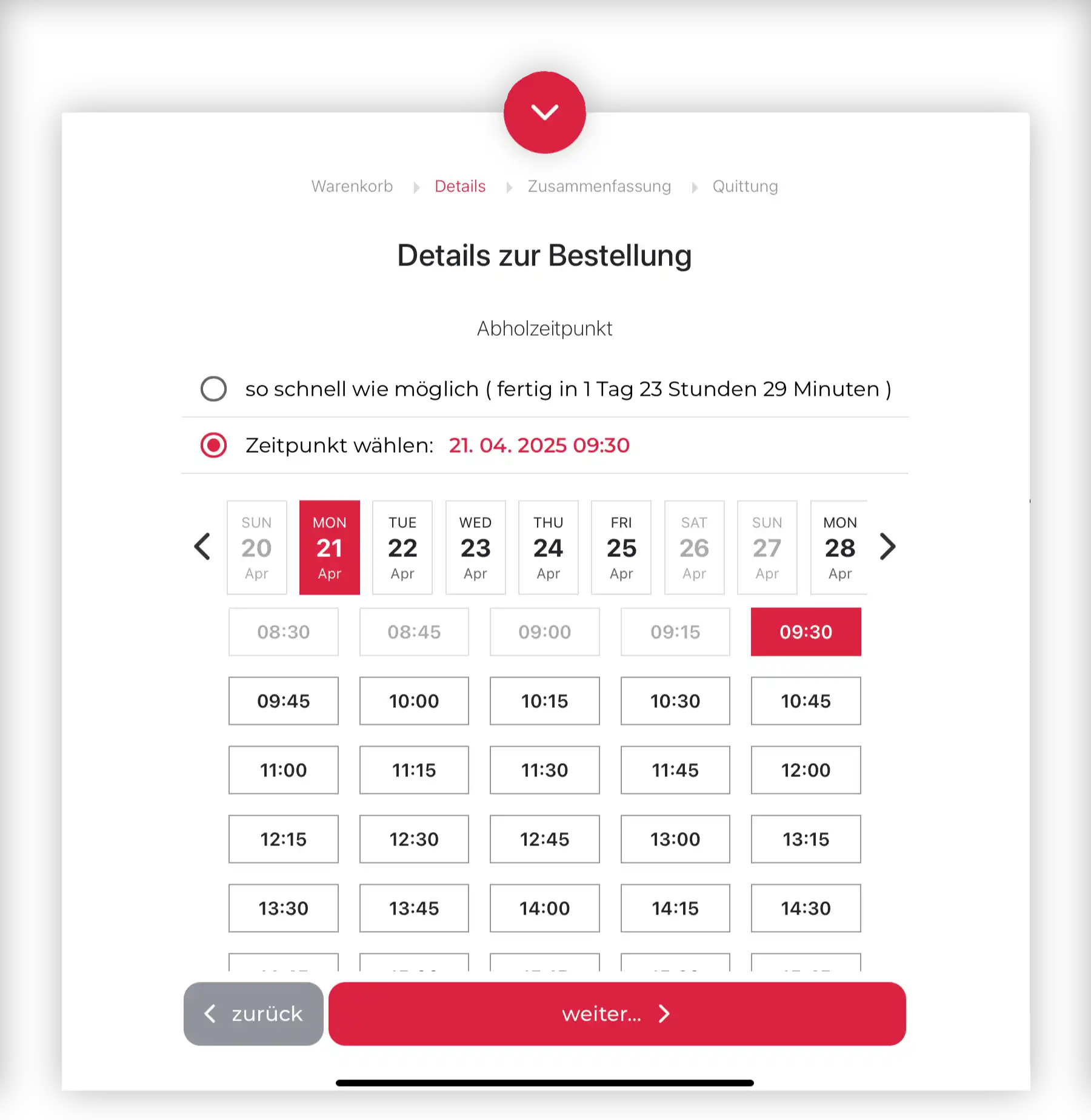 <figure><img src="https://3813206613-files.gitbook.io/~/files/v0/b/gitbook-x-prod.appspot.com/o/spaces%2FeK4oMzfvOzLa1xA217lX%2Fuploads%2FEx4am8rp1dBAKqvlN2Bs%2Ffrontend-pickup-slot-select.webp?alt=media&#x26;token=c4111739-769f-4d2b-8b82-847ce5f23773" alt="" width="188"><figcaption><p>Kundenansicht der Abholzeiten Auswahl im Bestellablauf</p></figcaption></figure>